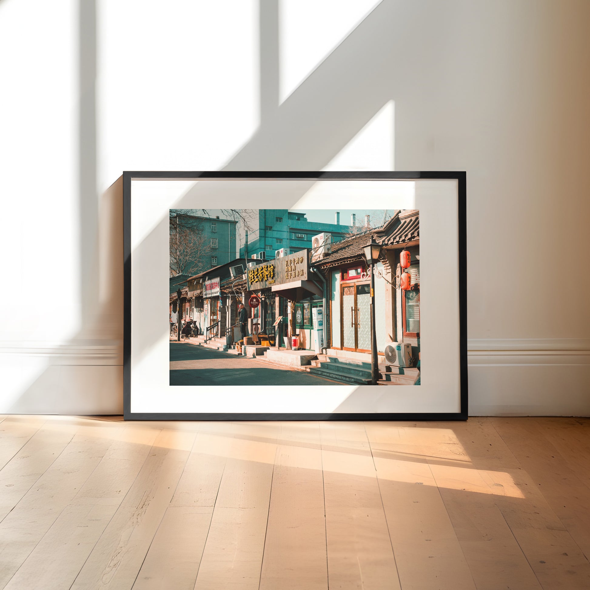 This composition highlights the subtle interplay between light and shadow, bringing out textures in the aged wood, stone, and traditional signage that evoke Beijing’s layered history. Each detail—the warm glow against the storefronts, the delicate hanging lanterns, and the stillness of the scene—offers a poetic reflection on the city’s quiet corners, capturing a sense of place that is both intimate and timeless.