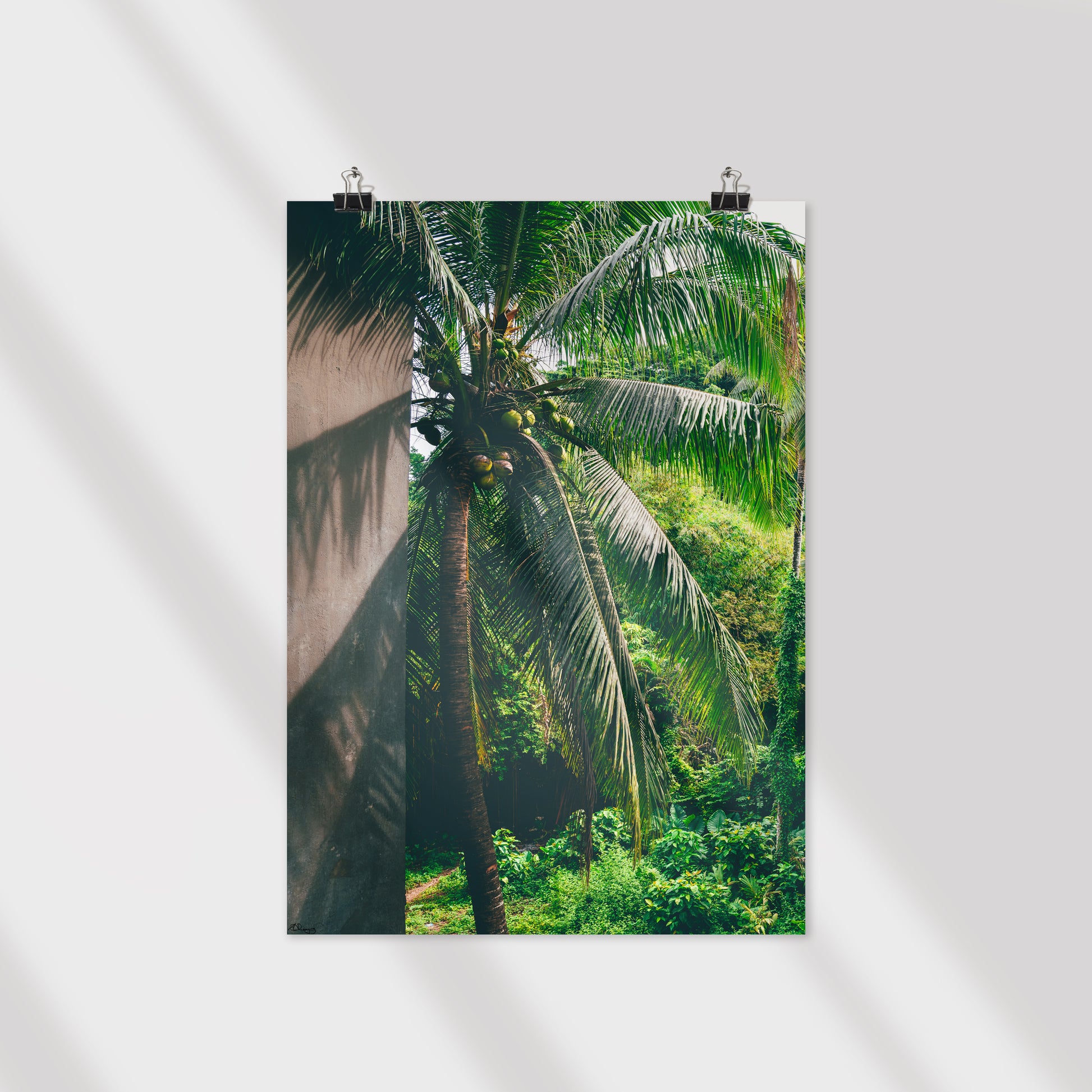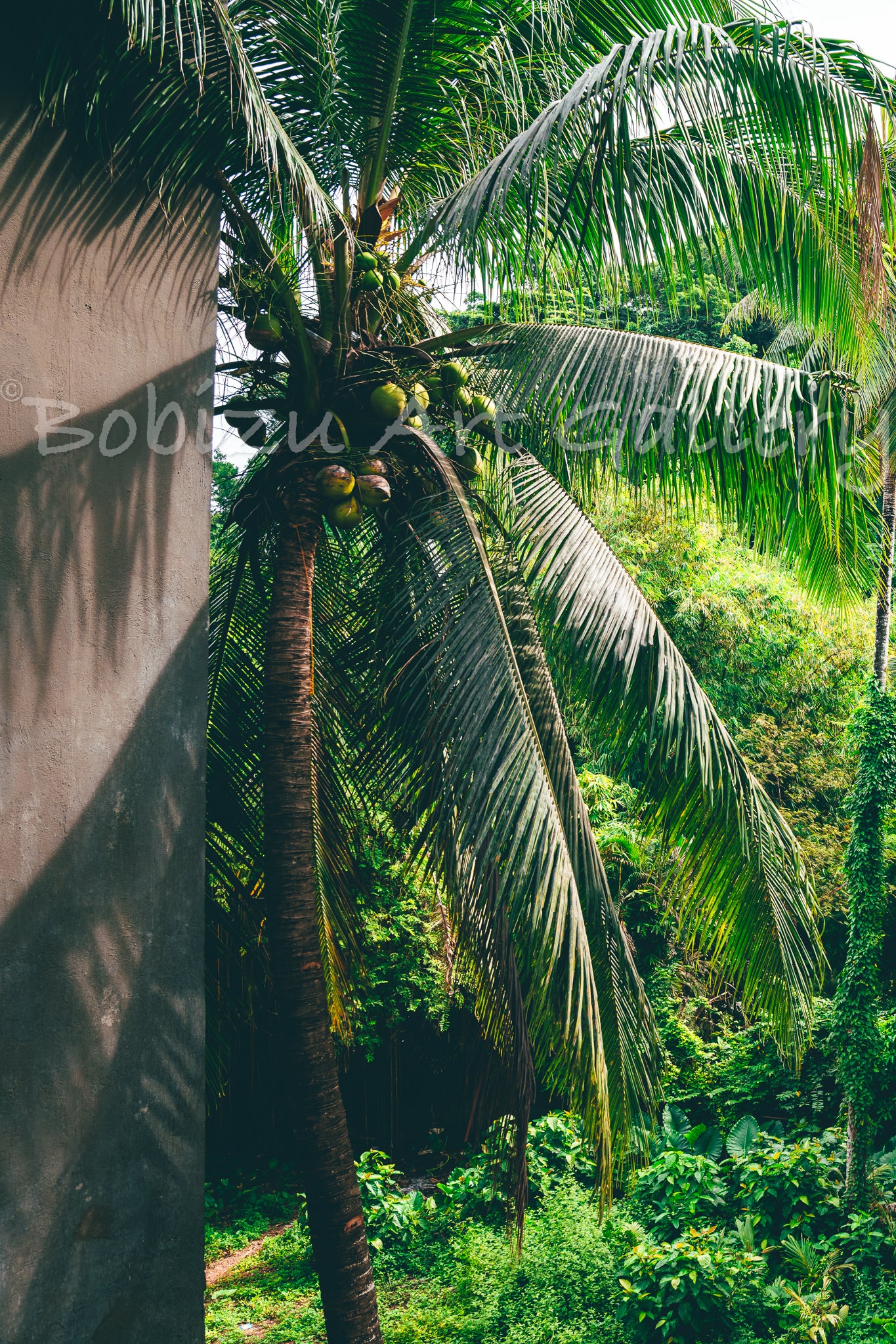 Tropical Mirage invites the viewer into the lush, serene beauty of the tropics, where sunlight dances on coconut palms, casting intricate shadows across textured surfaces. This captivating composition showcases a majestic coconut tree, its fronds creating a natural canopy over the vibrant greenery below. The juxtaposition of light and shadow on the tree trunk adds a subtle complexity, evoking a sense of depth and tranquility.