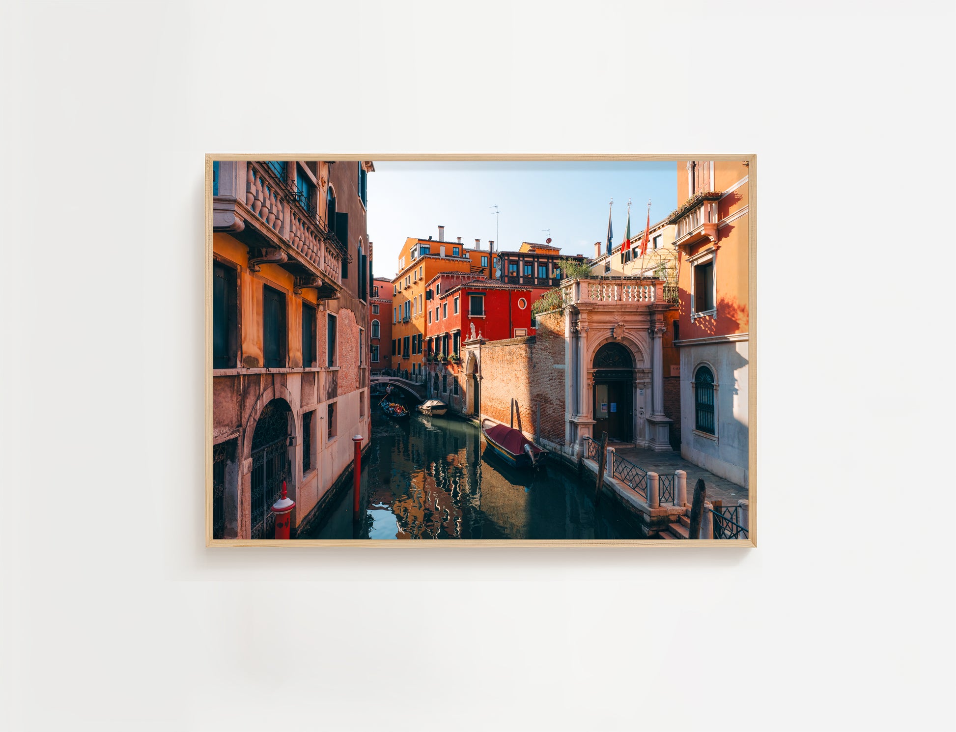 Venetian Hues captures a quiet canal in Venice, where sunlight illuminates the rich, earthy tones of historic buildings, creating a warm, vibrant palette. The photograph showcases the nuanced architecture of Venice: ornate facades and detailed arches blend seamlessly with colorful walls and shaded windows, reflecting elegantly in the still canal waters. This scene conveys Venice’s timeless allure, a place where every corner holds a story.