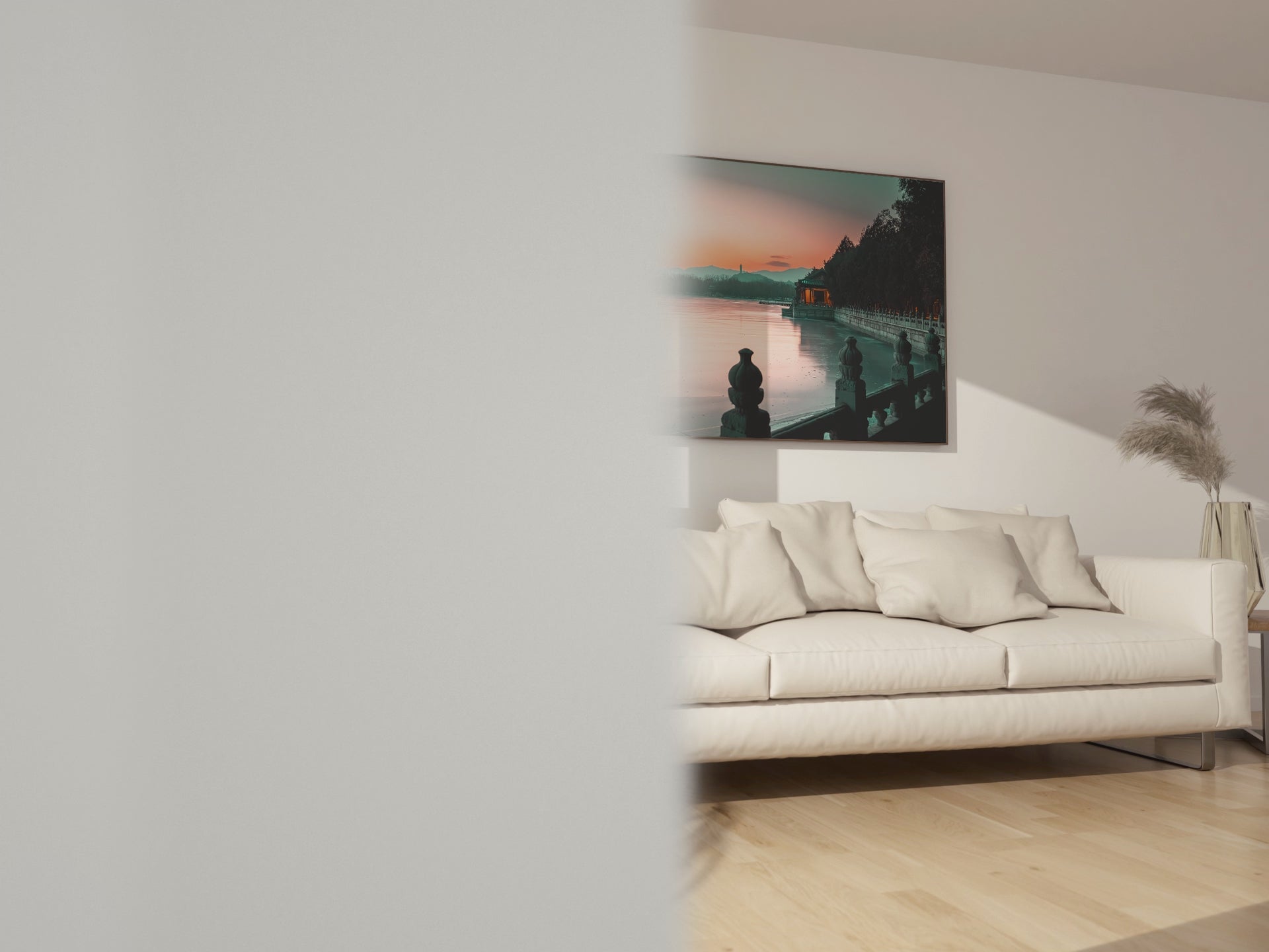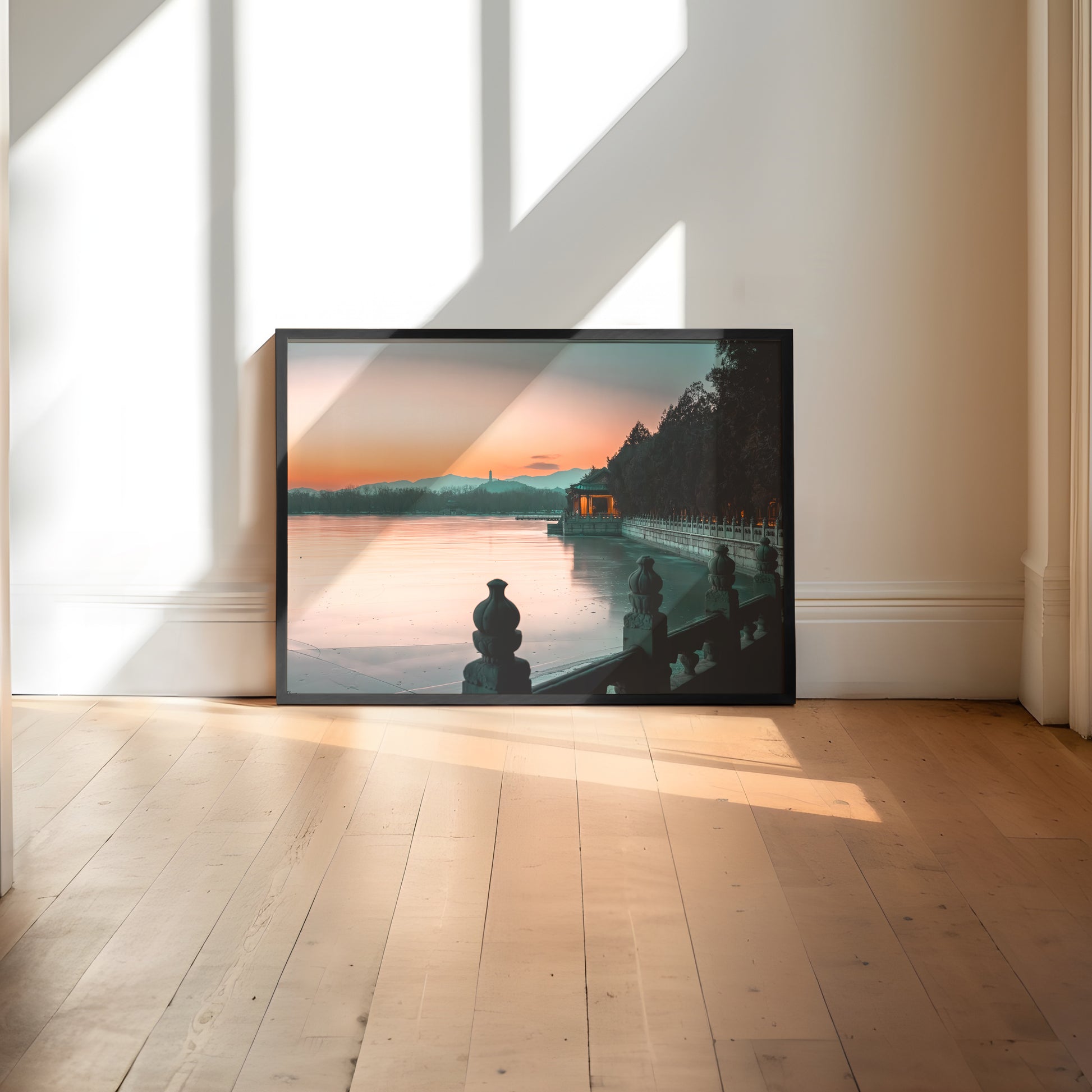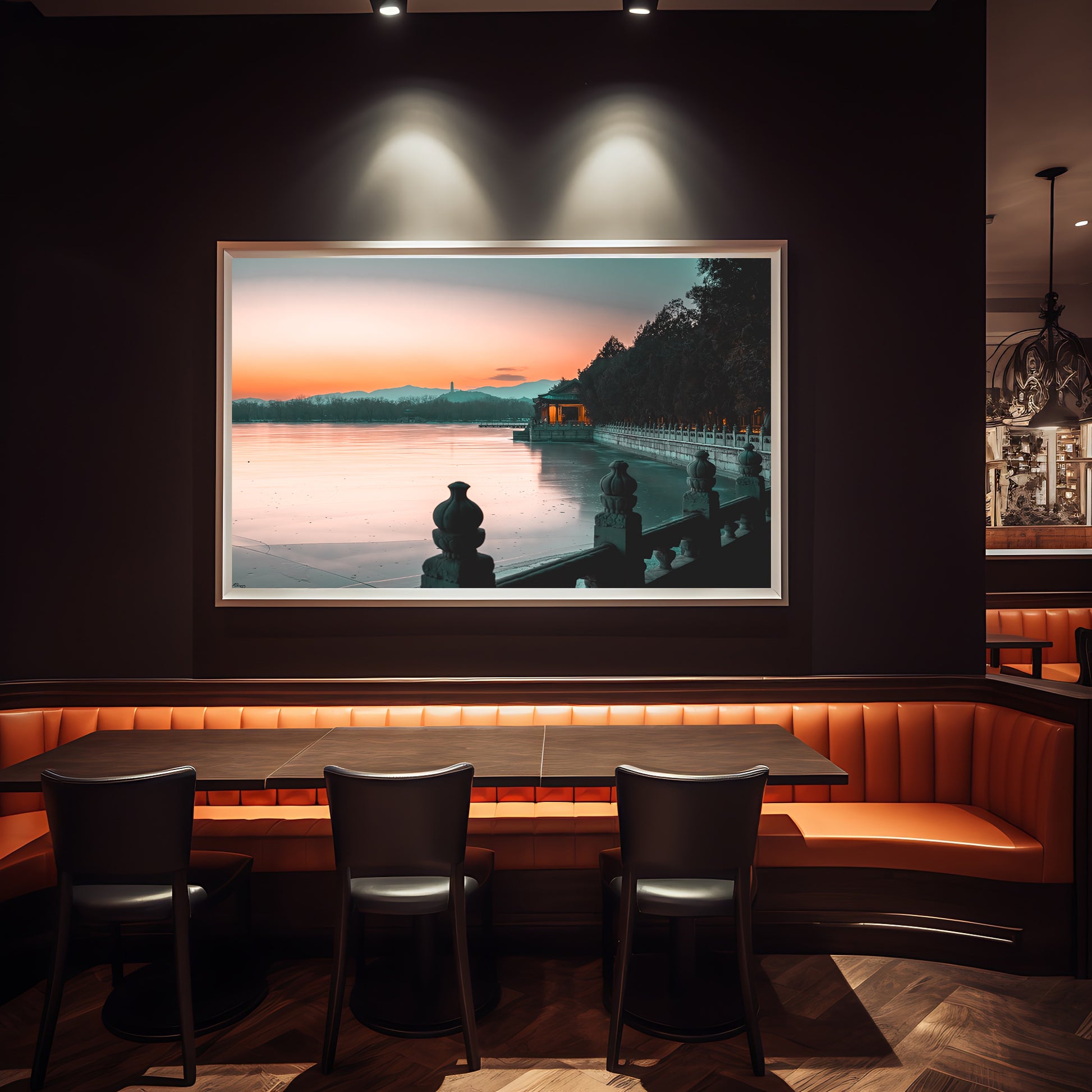 The subtle details—frost-kissed railings, silhouetted trees, and the distant mountains—compose a scene that speaks to the viewer with an understated grace. This work is ideal for interiors seeking a touch of calm sophistication, adding depth to spaces like hotel lobbies, dining rooms, or private collections.