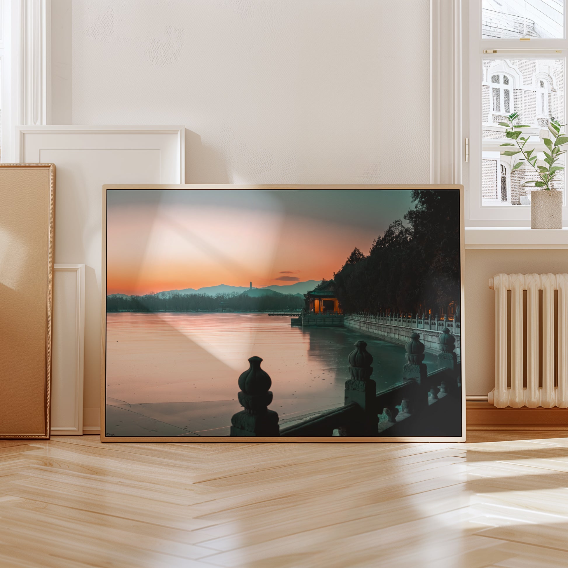 Winter’s Glow Over the Ancient Lake captures the serene beauty of a frozen lake under a sky painted in soft hues of pink and teal. The tranquil scene draws the eye toward the traditional pavilion, gently illuminated against the winter dusk, embodying the timeless elegance of Chinese architecture. The cool tones of the lake’s frozen surface blend seamlessly with the warm glow on the horizon, creating a harmonious balance between stillness and warmth.